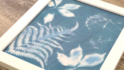 Place the piece of glass or plexiglass on top of the arranged leaves, grasses, and flowers and leave in the direct sun for 1-5 minutes, or until the paper turns very light blue