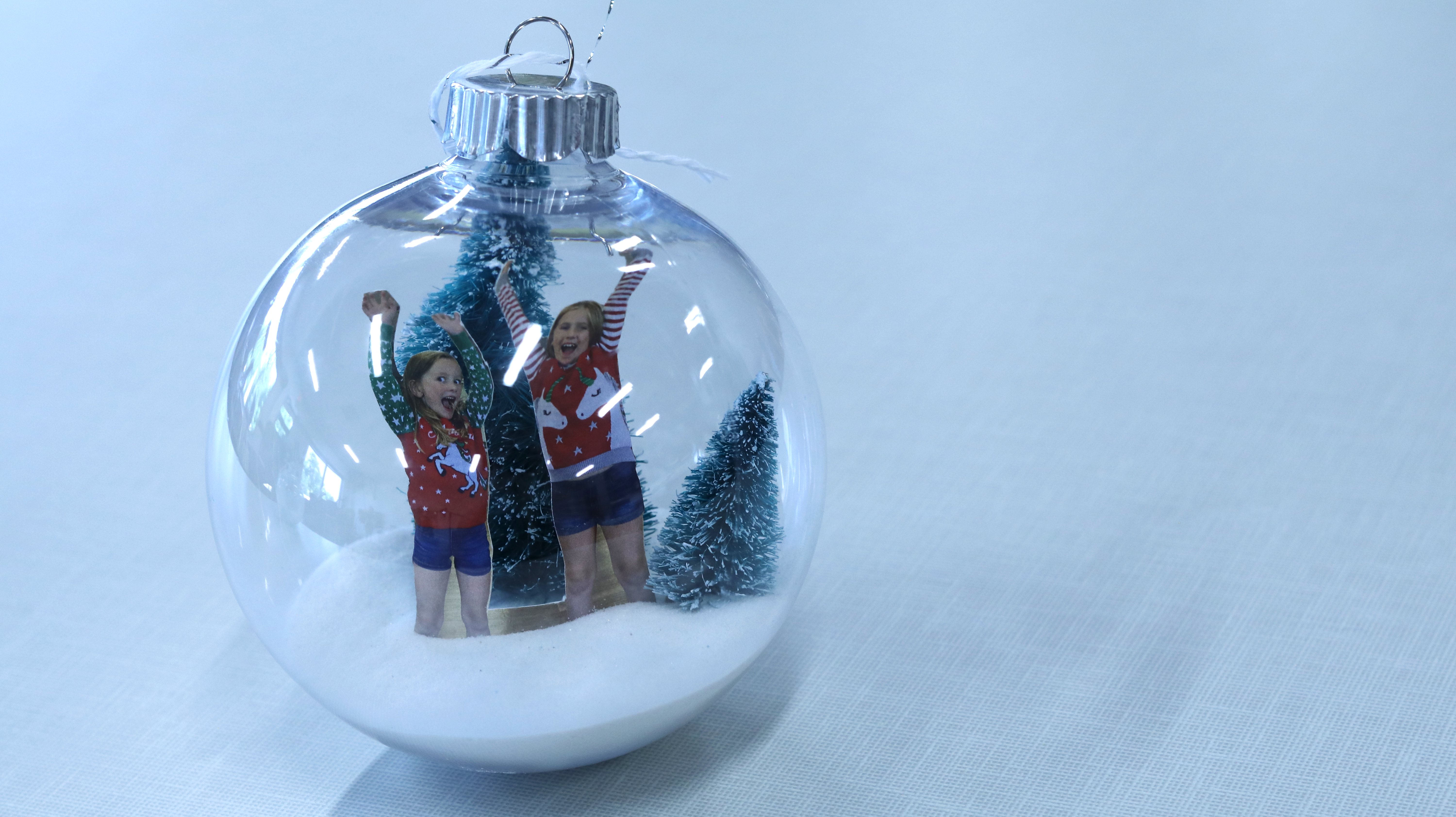 Place figurines, photo, etc. in empty ornament and use a pen to adjust them if needed