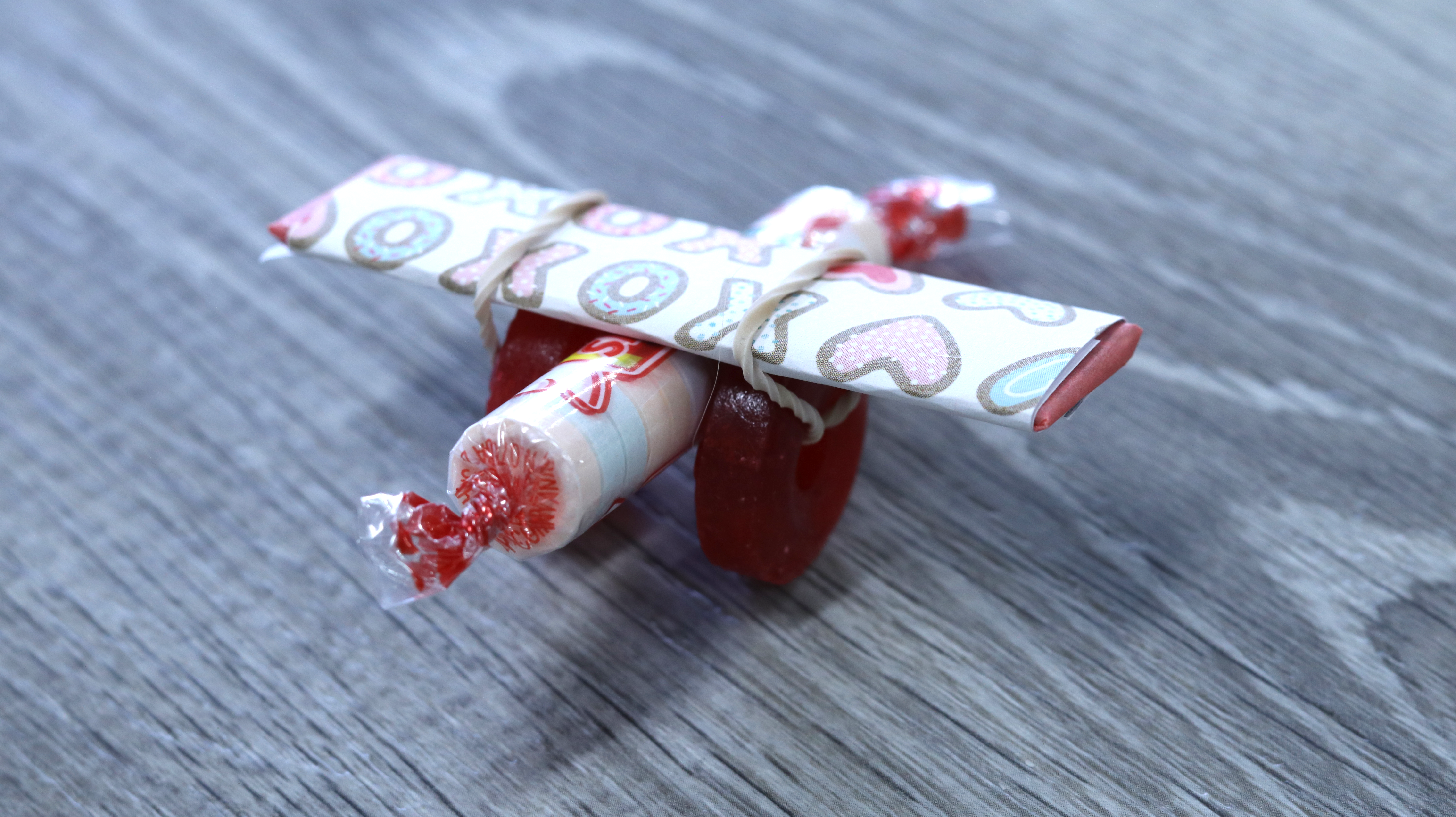 Pull up the rubber bands on each side and slide the stick of gum over the top of the Smarties roll and secure the stick of gum in place to create the airplane’s wings.