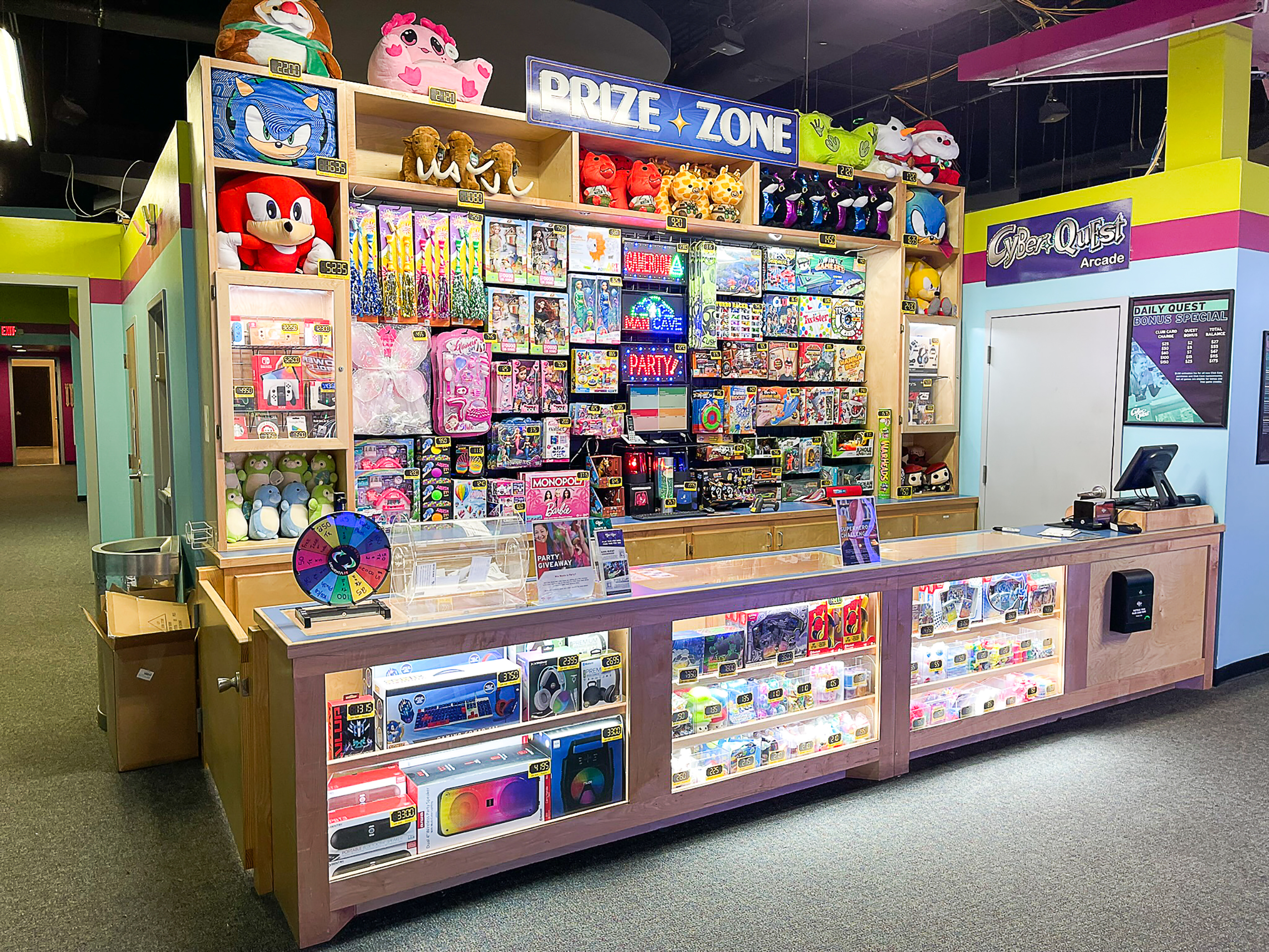 Cyber Quest is an arcade-like no other! Our family-friendly entertainment venue features only non-violent game content in a bright, colorful, and inviting space. In addition, at Cyber Quest we take great pride in providing a very high level of guest service and interaction from our courteous and enthusiastic team. Best of all, we program our games to deliver generous payouts for play so that everyone will enjoy their redemption experience at our signature Cyber Quest Prize Zone! The Prize Zone? Don’t miss it! There we stock everything from novelty toys and plush, to high-end technology!